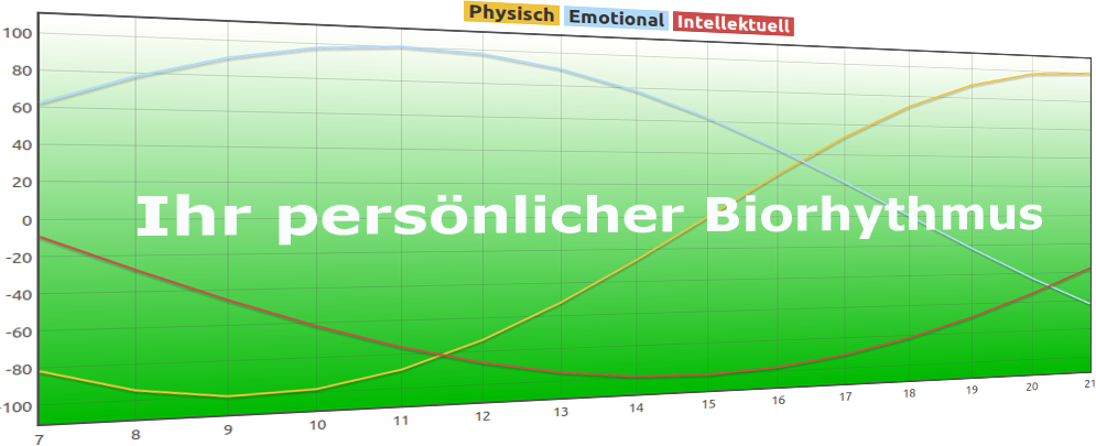 Nutzen Sie die Möglichkeit Ihren ganz persönlichen Biorhythmus kostenlos berechnen zu lassen. Nach der Eingabe Ihres Geburtstages und Mausklick auf [Berechnen] wird Ihnen Ihr Biorhythmus angezeigt.