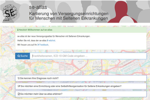 Auf der Internetseite www.se-atlas.de können sich Betroffene, Angehörige und Ärzte, aber auch nicht-medizinisches Personal und die breite Öffentlichkeit künftig einen umfassenden Überblick über Versorgungsmöglichkeiten für Menschen mit seltenen Erkrankungen (SE) in Deutschland verschaffen. Ziel des vom Bundesministerium für Gesundheit geförderten Projektes ist es letztlich, durch gezielte und ausführliche Informationen die Versorgung von Menschen mit seltenen Erkrankungen zu verbessern.
