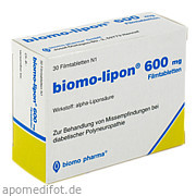 BIOMO LIPON 600: Thioctsäure (Alpha-Liponsäure) ist eine bei höheren Lebewesen im körpereigenen Stoffwechsel gebildete Substanz, die bestimmte Stoffwechselleistungen des Körpers beeinflusst. Darüber hinaus besitzt Thioctsäure (antioxidative) Eigenschaften, die die Nervenzelle vor reaktiven Abbauprodukten schützen. Das Arzneimittel wird angewendet bei Missempfindungen bei diabetischer Nervenschädigung (Polyneuropathie).