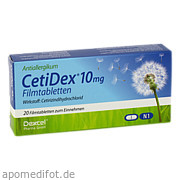 CetiDex 10mg: Cetirizindihydrochlorid ist der Wirkstoff des Präparates. Das Arzneimittel ist ein Antiallergikum. Bei Erwachsenen und Kindern ab einem Alter von 6 Jahren ist das Arzneimittel angezeigt zur: Linderung von Nasen- und Augensymptomen bei saisonaler und ganzjähriger allergischer Rhinitis. Linderung von chronischer Nesselsucht (chronischer idiopathischer Urtikaria). ... (mehr siehe: "Produktinformationen")