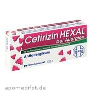 Cetirizin Hexal bei Allergien: Cetirizindihydrochlorid ist der Wirkstoff des Präparates. Das Arzneimittel ist ein Antiallergikum. Bei Erwachsenen und Kindern ab einem Alter von 6 Jahren ist das Arzneimittel angezeigt zur: Linderung von Nasen- und Augensymptomen bei saisonaler und ganzjähriger allergischer Rhinitis. Linderung von chronischer Nesselsucht (chronischer idiopathischer Urtikaria). ... (mehr siehe: "Produktinformationen")