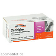 Cetirizin-ratiopharm bei Allergien 10 mg Filmtabl.: Cetirizindihydrochlorid ist der Wirkstoff des Präparates. Das Arzneimittel ist ein Antiallergikum. Bei Erwachsenen und Kindern ab einem Alter von 6 Jahren ist das Arzneimittel angezeigt zur: Linderung von Nasen- und Augensymptomen bei saisonaler und ganzjähriger allergischer Rhinitis. Linderung von chronischer Nesselsucht (chronischer idiopathischer Urtikaria). ... (mehr siehe: "Produktinformationen")