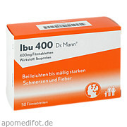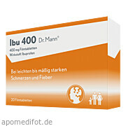 IBU 400 Dr. Mann: Das Arzneimittelist ein entzündungshemmendes und schmerzstillendes Arzneimittel (nicht-steroidales Antiphlogistikum/Analgetikum). Es enthält den Wirkstoff Ibuprofen. Das Arzneimittel wird angewendet bei leichten bis mäßig starken Schmerzen wie Kopfschmerzen, Zahnschmerzen, Regelschmerzen; Fieber.