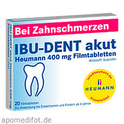 IBU-DENT akut Heumann 400mg Filmtabletten: Das Arzneimittelist ein entzündungshemmendes und schmerzstillendes Arzneimittel (nicht-steroidales Antiphlogistikum/Analgetikum). Es enthält den Wirkstoff Ibuprofen. Das Arzneimittel wird angewendet bei leichten bis mäßig starken Schmerzen wie Kopfschmerzen, Zahnschmerzen, Regelschmerzen; Fieber.