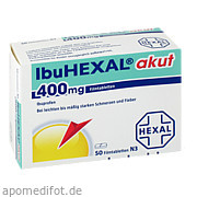 IbuHEXAL akut 400mg Filmtabletten: Das Arzneimittelist ein entzündungshemmendes und schmerzstillendes Arzneimittel (nicht-steroidales Antiphlogistikum/Analgetikum). Es enthält den Wirkstoff Ibuprofen. Das Arzneimittel wird angewendet bei leichten bis mäßig starken Schmerzen wie Kopfschmerzen, Zahnschmerzen, Regelschmerzen; Fieber.