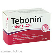 Tebonin intens 120mg: Das Arzneimittel enthält einen Extrakt aus Ginkgo-Blättern. Das Arzneimittel wird angewendet Zur symptomatischen Behandlung von hirnorganisch bedingten geistigen Leistungseinbußen. Die Anwendung erfolgt im Rahmen eines therapeutischen Gesamtkonzeptes bei fortschreitender Abnahme bzw. Verlust erworbener geistiger Fähigkeiten (dementielles Syndrom) mit den Haupt-beschwerden: Gedächtnisstörungen, Konzentrationsstörungen, Niedergeschlagenheit, Schwindel, Ohrensausen, Kopfschmerzen. ... (mehr siehe: "Produktinformationen")