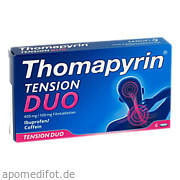 Thomapyrin TENSION DUO 400 mg/100mg Filmtabletten: Das Arzneimittel enthält zwei Wirkstoffe: Ibuprofen und Coffein. Ibuprofen gehört zu einer Gruppe von Arzneimitteln, die nichtsteroidale Antirheumatika (NSAR) genannt werden. NSAR sorgen für Linderung, indem sie die Art und Weise, wie der Körper auf Schmerzen und Fieber reagiert, verändern. Coffein gehört zu einer Gruppe von Arzneimitteln, die ... (mehr siehe: "Produktinformationen")